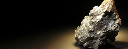 Allargentum is a rare precious natural geological stone eremite on a black background in low key. Fashionable jewelry elegant decoration. AI generated. Header banner mockup with space.