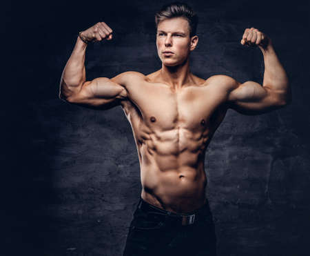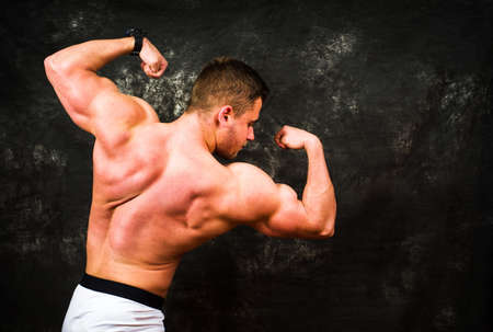 Bodybuilder flexing muscles against dark textured background