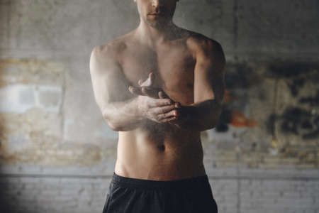 Close-up of young man preparing hands with talcum powder before training