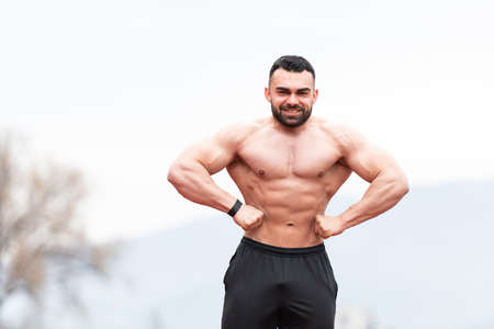 Attractive young guy demonstrates muscular torso outdoors. Beautiful physique. Fitness and lifestyle concept. Pronounced muscles of the press. Athletic physique.