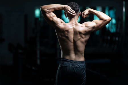Strong bodybuilder flexing arms muscles black background. Fit bodybuilder showing muscular body. Professional coach demonstrate achievements. Exercises for back. Bodybuilder perfect shape rear view