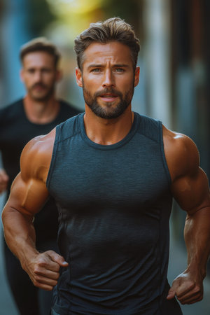 Two fit men sprint down a city street in the late afternoon, highlighting their toned physiques. One runner leads with focused intent, while the other follows closely behind, emphasizing an active lifestyle and camaraderie.