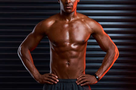 Closeup view of sexy young black guy with muscular bare torso posing in neon light. Strength workout concept