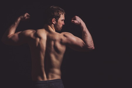 sporty man naked torso inflated body posing dark background