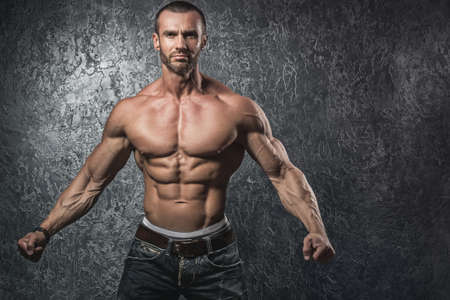 Confident sexy professional sportsman stands topless near the grey wall. Fitness, bodybuilding, Healthy lifestyle concept.