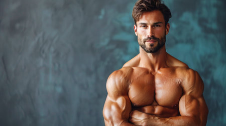 A muscular man stands with confidence against a gritty background, his physique sculpted like ancient marble statues.