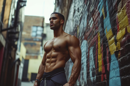 A muscular man stands in an urban alley, displaying his toned body against a colorful graffiti backdrop.