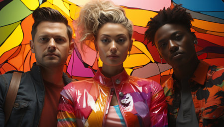 Men, women, and young women smiling in a colorful fashion celebration generated by artificial intelligence