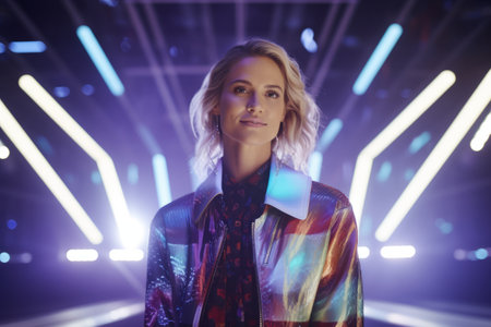 Portrait of beautiful young woman with blond hair in neon light.