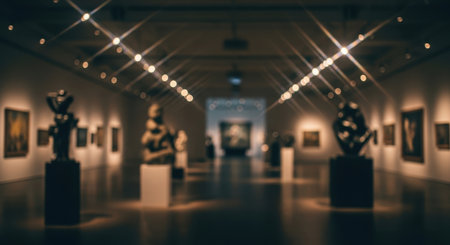 Dimly lit art gallery with abstract sculptures and paintings on display, featuring a blurred cinematic effect and starburst light reflections from the ceiling.