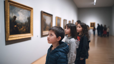 Children explore a museum exhibition, captivated by classic paintings, embodying curiosity and engagement with art in a culturally rich environment.