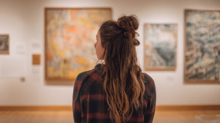 Adult woman admiring art in historical art gallery seen from behind. Concept Art Appreciation, Museum Visit, Historical Gallery, Cultural Experience, Visitor Perspective