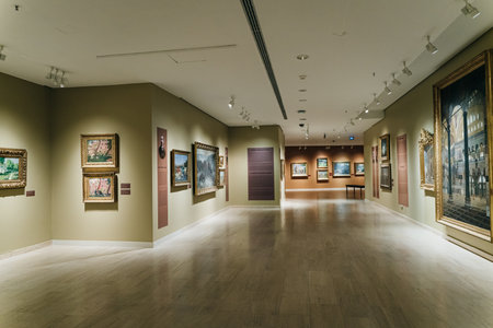 Stunning interior view of an art gallery featuring framed paintings displayed elegantly against soft lighting, evoking tranquility and sophistication.