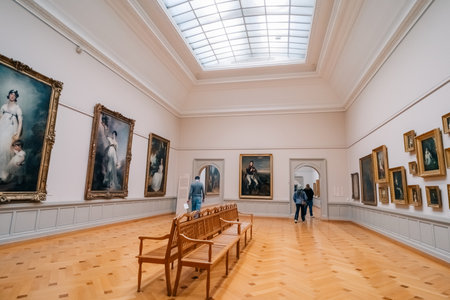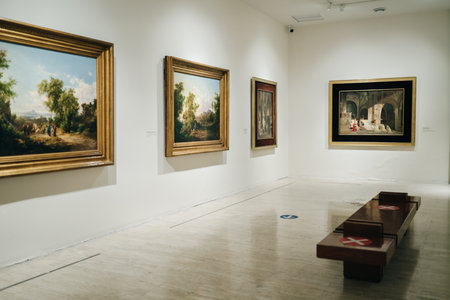 The museums hall is adorned with various artworks displayed on the hardwood flooring. The paintings are beautifully showcased in picture frames on the walls