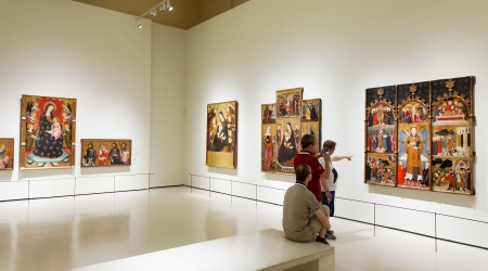 Visitors of national museum of Catalan visual art viewing paintings