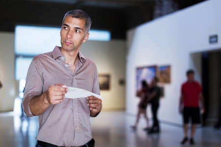 Adult male is visiting at the pictures exposition with brochure