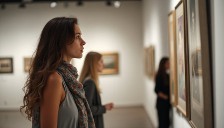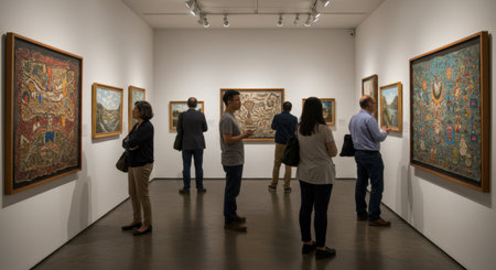 Visitors engaging with art in a vibrant gallery setting, appreciating creative masterpieces