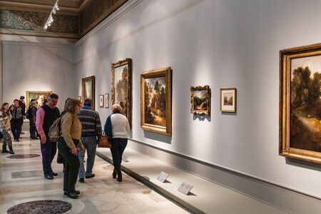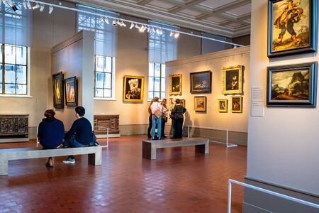MOSCOW, RUSSIA - JANUARY 25, 2019: visitors in hall of Dutch and Flemish art in main exhibition in Pushkin State Museum of Fine Arts. Pushkin Museum is the largest museum of European art in Moscow