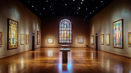 An elegant art gallery featuring stunning stained glass windows and beautiful artwork. The space is designed to enhance the viewing experience with illuminating lights.