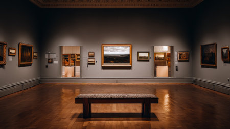 A serene art gallery interior featuring a wooden bench and paintings on the walls, creating a peaceful environment for art appreciation and inspiration.