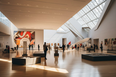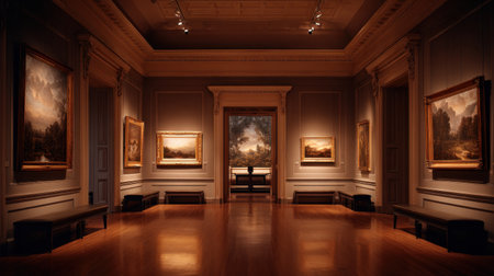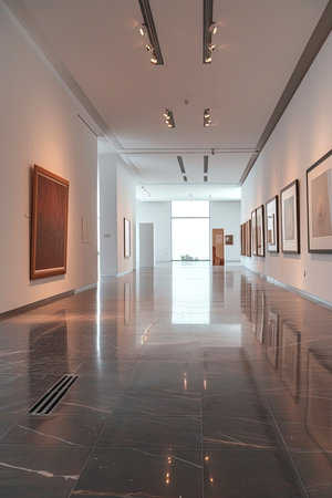 In a contemporary art gallery, an exhibition unfolds with captivating artworks adorning the walls. The space is devoid of people, allowing the art to speak for itself. Generative AI