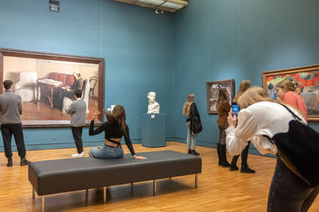 PARIS, FRANCE - October 2, 2016: Visitors in permanent collection hall of Musee d'Orsay. Musee d'Orsay has the largest collection of impressionist and post-impressionist paintings in the world