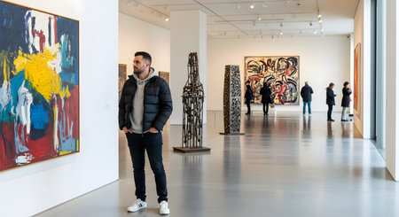 A man wearing a grey hoodie and a black puffer jacket stands thoughtfully in a bright, modern art museum, looking at a large, colorful abstract painting. The spacious gallery features high ceilings, white walls, and other art pieces and visitors in the background.