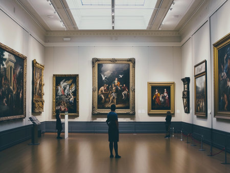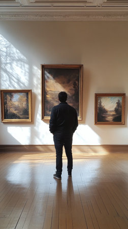Lone visitor contemplates paintings in the tranquil ambiance of an art gallery