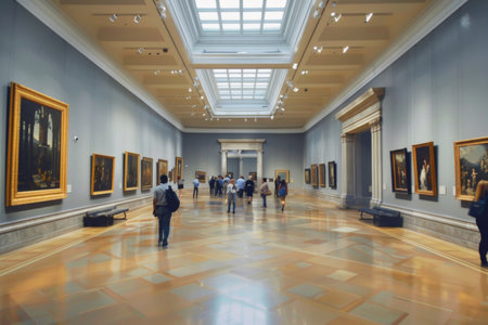 Art enthusiasts wander through a spacious gallery, admiring vintage artworks displayed against soft blue walls. The grand architecture enhances the atmosphere of culture and creativity.