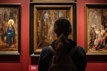 Tourist with a backpack admiring framed paintings hanging on a vibrant red wall in an art museum, immersed in culture and history