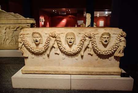 Antalya, Turkey - May 20, 2019: Marble sarcophagus. Sarcophagi from the excavations of the city of Perge. Scenes and symbols carved in the bas-relief on the walls of the sarcophagus. Museum of antiquity of Antalya.
