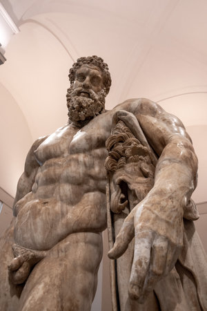 NAPLES, ITALY - MAY 06, 2022 - Giant ancient Roman Hercules statue with a big stick looking down at the observer, Italy