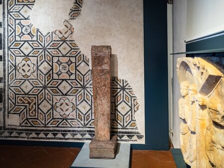 BRESCIA, ITALY - FEBRUARY 21, 2019: ancient mosaic wall in Monastery of Santa Giulia in Brescia. Santa Giulia inscribed on List of World Heritage of UNESCO as Longobards in Italy, Places of the power