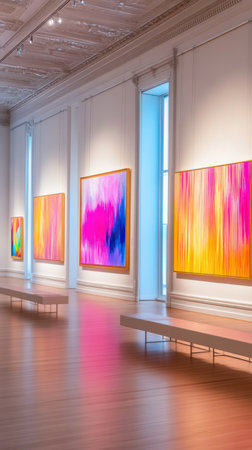 In a contemporary art gallery, an exhibition unfolds with captivating artworks adorning the walls. The space is devoid of people, allowing the art to speak for itself. Generative AI