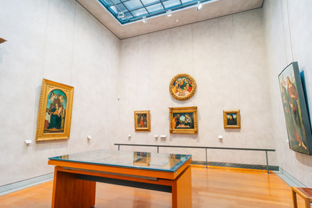 Explore the serene interior of an art gallery showcasing classic paintings. The elegant space features warm lighting and stunning architecture, inviting admiration.