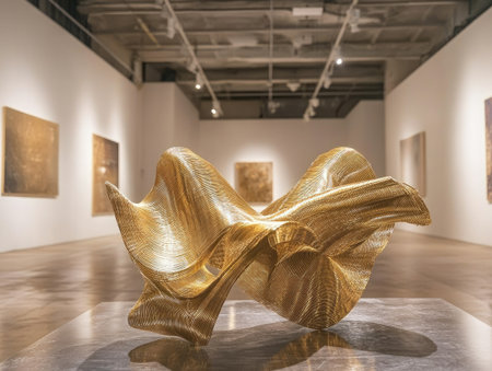 A complex 3D-printed gold sculpture displayed in an art gallery, showcasing precision technology