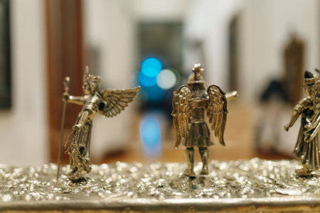 A stunning array of golden artifacts displayed in a museum exhibition, showcasing intricate designs and cultural heritage. Perfect for art enthusiasts.