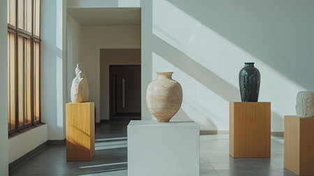 A bright gallery showcasing various artistic pottery sculptures on display pedestals, illuminated by natural light and featuring modern design aesthetics.