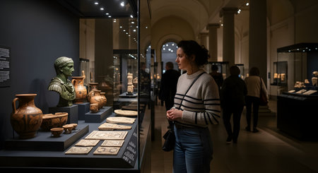 A woman wearing a striped sweater and jeans stands thoughtfully in a dimly lit museum, observing an exhibit of ancient pottery and a sculpted bust behind a glass display. Other visitors are visible in the background, adding to the atmosphere of cultural exploration and historical education. The scene captures a moment of quiet contemplation and learning.