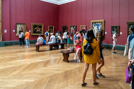 London, UK - May 14 2018: The National Gallery in Trafalgar Square founded in 1824, it houses a collection of over 2,300 paintings dating from the mid-13th century to 1900