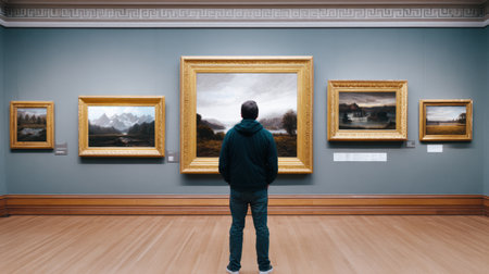 A contemplative individual stands in an art gallery, captivated by classic landscape paintings in ornate golden frames, surrounded by a serene atmosphere.