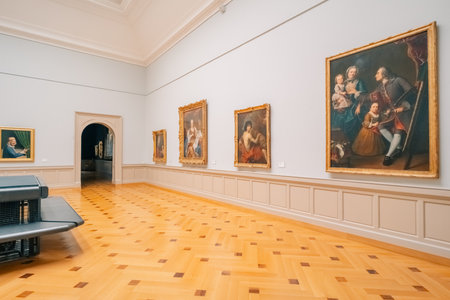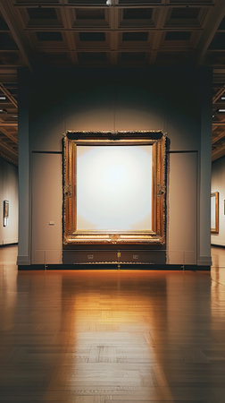 Explore the serene interior of an art gallery showcasing classic paintings. The elegant space features warm lighting and stunning architecture, inviting admiration.
