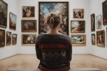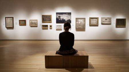 A thoughtful visitor sits on a wooden bench, absorbing the beauty of artworks displayed on clean gallery walls, highlighting creativity and inspiration.