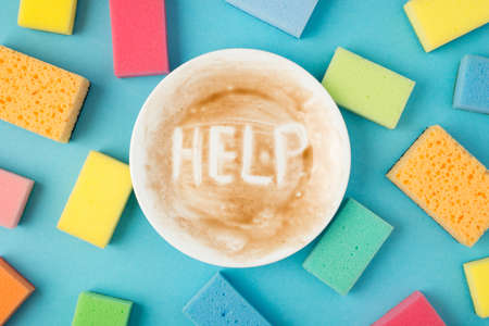 Top view photo of dirty plate with inscription help and multicolor sponges on isolated blue background
