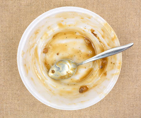 Top view of a finished TV dinner bowl with a spoon on a cloth background