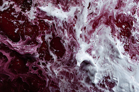 Acrylic pigment. Fluid art. Defocused red crimson color dirty ripple texture drop paint in water splatter spreading on abstract background.
