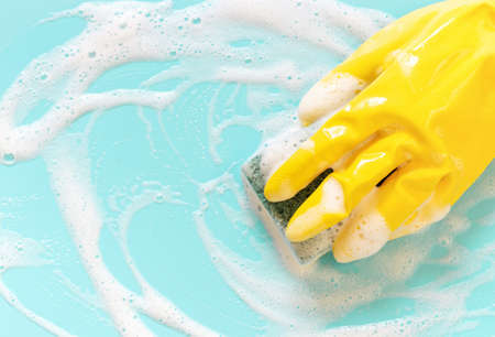 Hand in a yellow rubber gloves wipe the surface with sponge with foam.