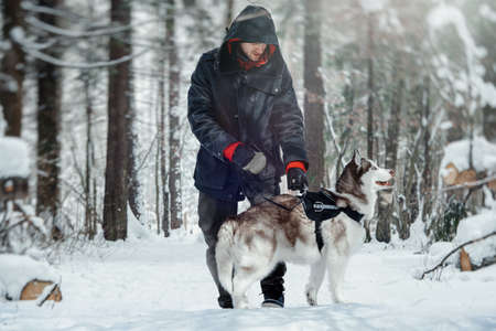 Man and Cute Siberian Husky dog in forest on sunny winter day. Concept of animal wellbeing and owner care and love.