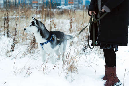 young woman winter clothes walking the dog husky in the snow winter holidays