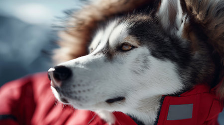 Siberian husky resting in snow with winter jacket on a cold day in the mountains